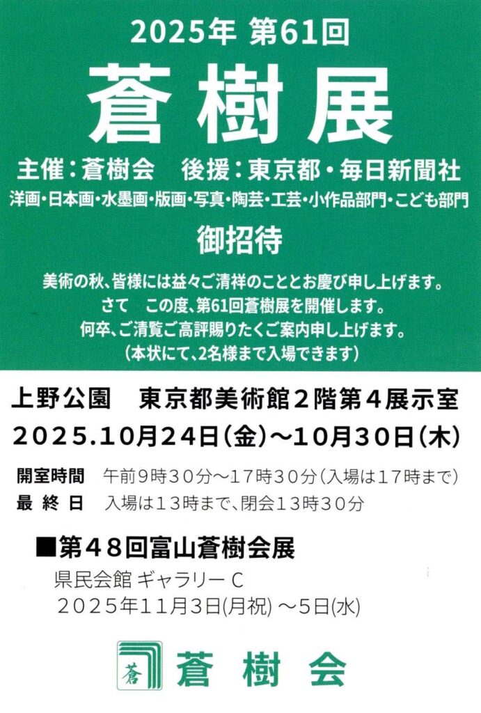 9月 21, 2025管理人@葛美展覧会情報 葛飾区美術会会員の小幡 さん・江連 さんが出品予定です。ご高覧頂きたくご案内申し上げます。 会期:2025年 10月24日(金)~30日(木) 開場:9:30~17:30 会場:東京都美術館館 2F第4展示室 住所:〒110-0007 東京都台東区上野公園8−36 電話:03-3823-6921 最寄り駅:JR山手線 上野駅